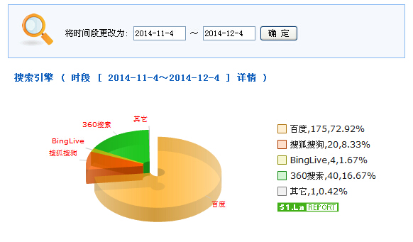 搜索引擎來路的流量百分比:百度流量占總流量73%,其他搜索引擎流量依次為360,搜狐,binglive